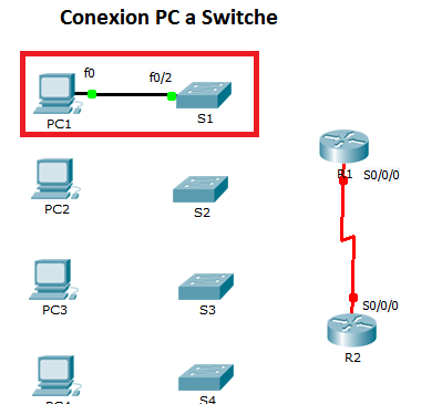 A continuación se hacen conexiones teniendo en cuenta las interfaces y el tipo de cable donde se deben conectar entre R1 con R1, PC1 con S1 y S1 con R1 y así sucesivamente las demas conexiones de R2